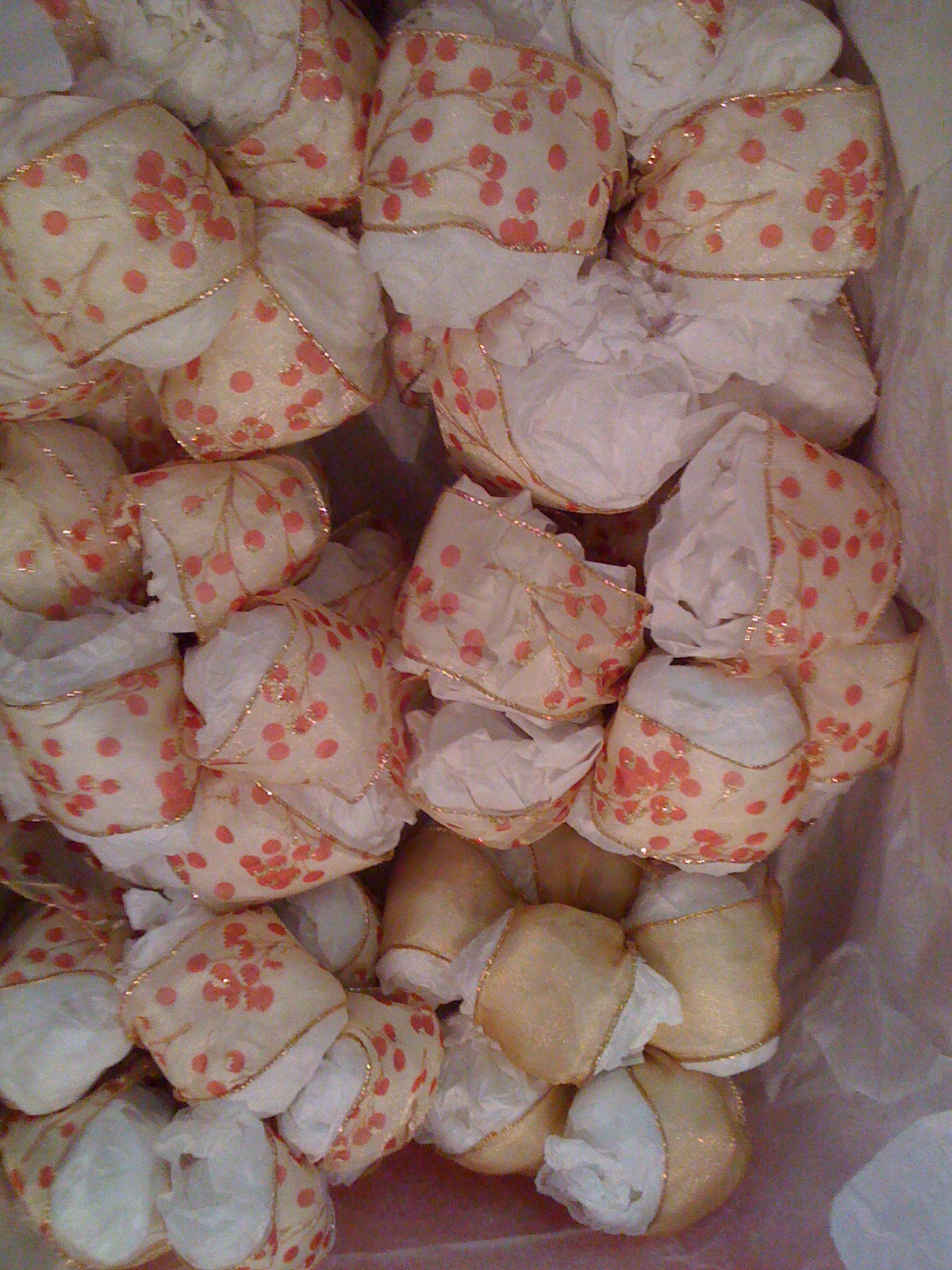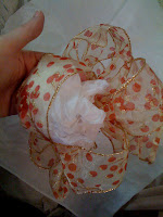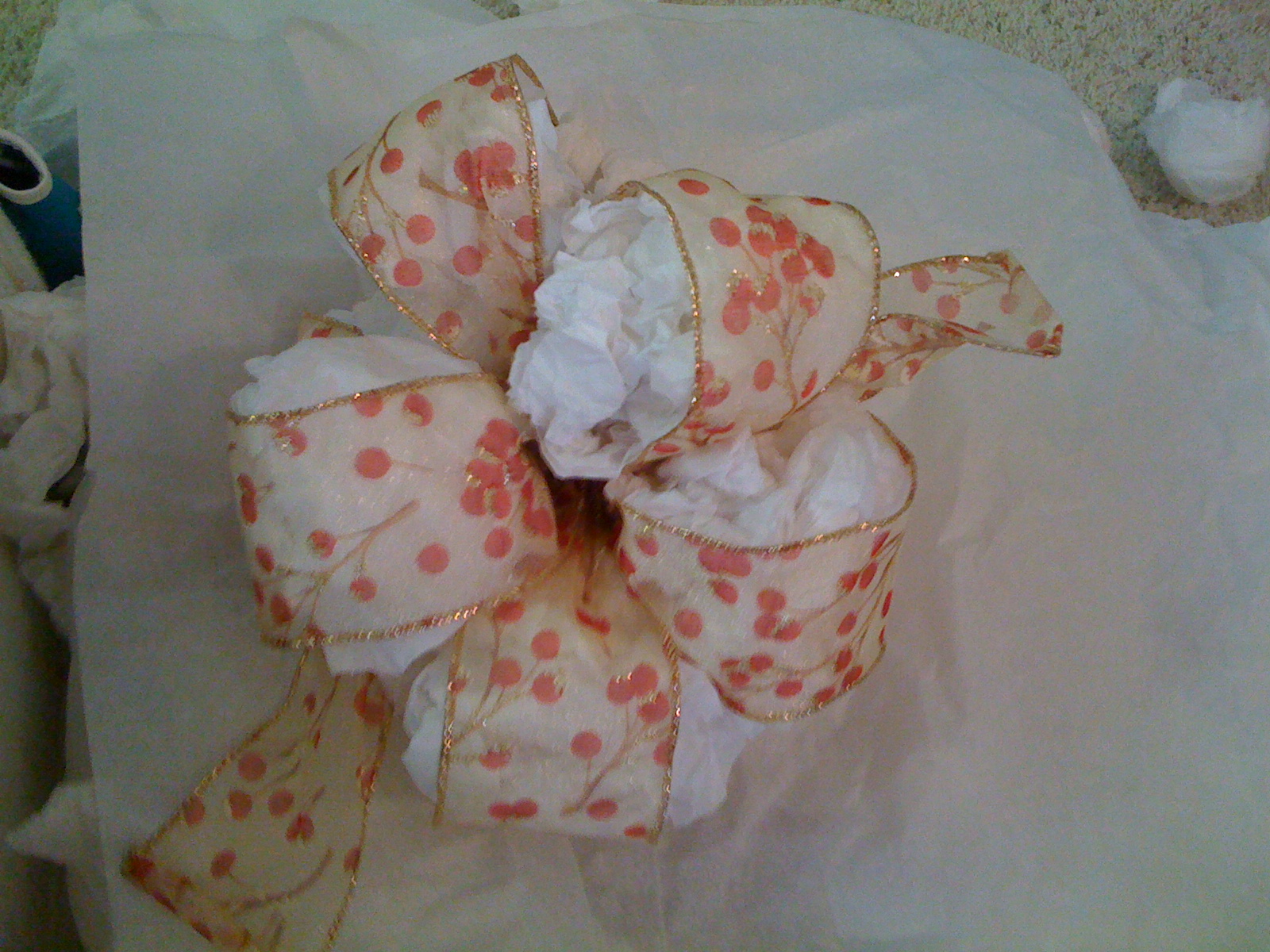 Begin with one large and one small styrofoam circle. Cover them in a color of tissue paper that coordinates with your ribbon (that way if it peaks through, it still matches!).