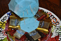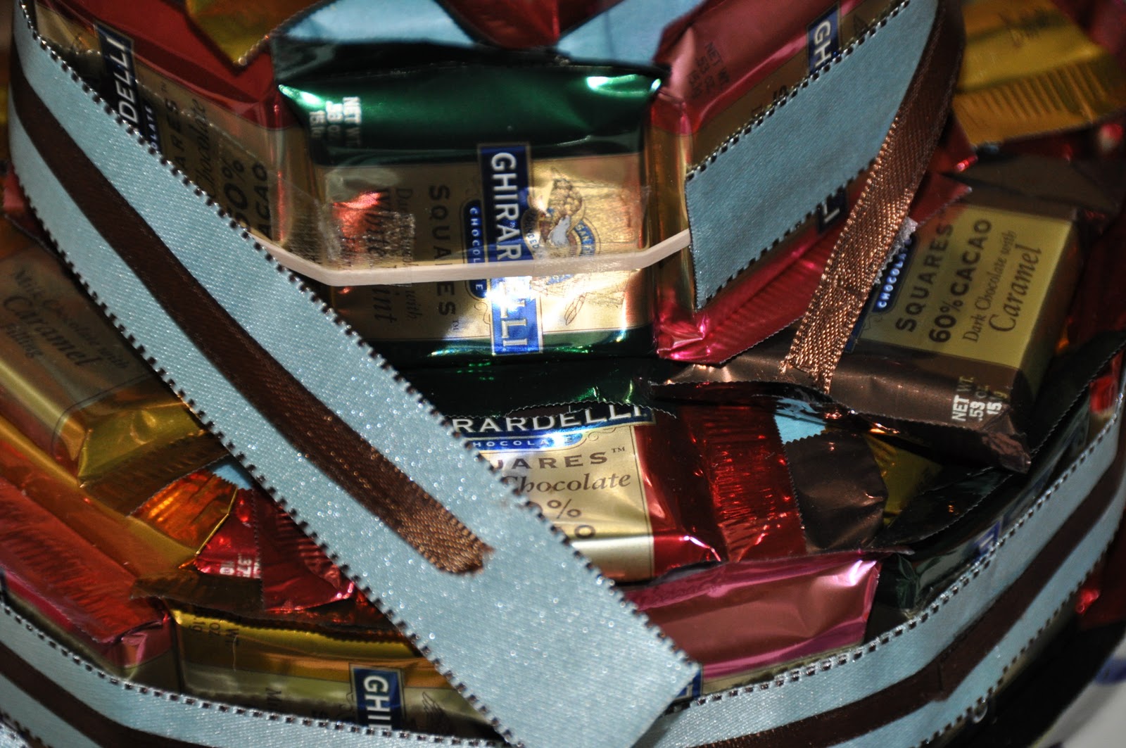 Attach the chocolates around the outer edge with pieces of two-face tape. After they are in place, wrap a rubber band around to hold them in place. This will be covered up by the ribbon later.